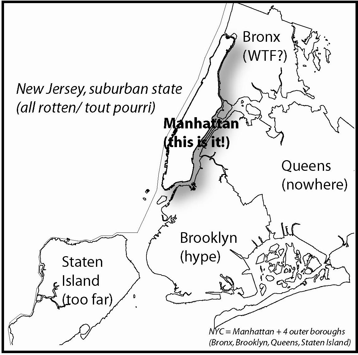 Bon, je me rends bien compte que ça peut paumer les gens de parler d’endroits comme ça, qui moi me paraissent trop EVIDENTS, surtout quand tu es une géographe avec un sens de l’orientation de la mort qui tue et qui en plus fait sa thèse sur le truc, mais qui le sont moins pour d’autres (qu’ils soient déjà venus à New York ou pas en fait, je me rends compte que je traîne plus à Brooklyn que beaucoup de New-Yorkais, quand au Bronx n’en parlons pas ! Mais les « outer boroughs » ce sera pour une autre fois, on va la commencer simple)