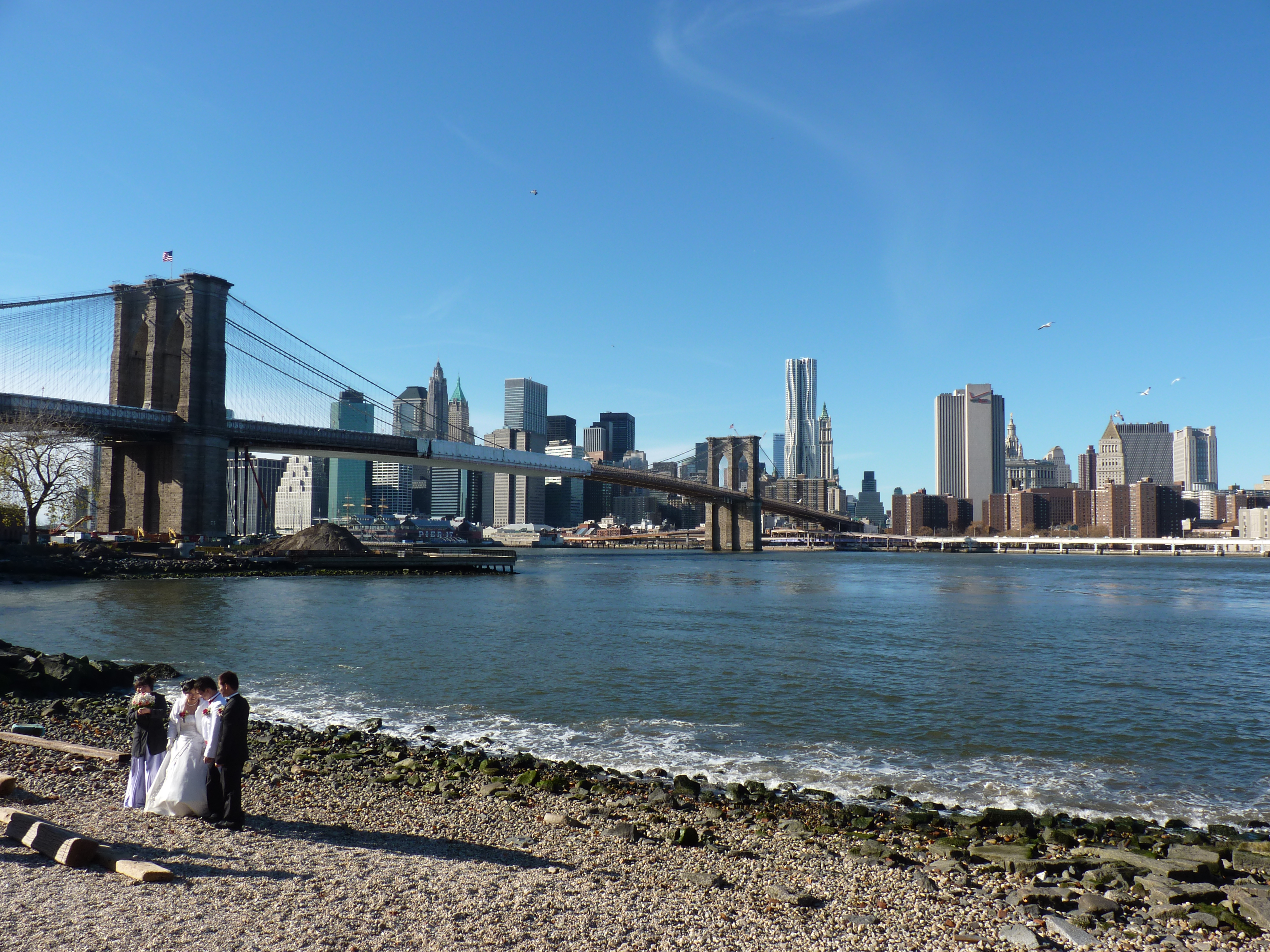 Qu’est-ce qui fait la richesse du front d’eau de Brooklyn, Queens et j’en passe ? « It’s the view », bien sûr ! Toute cette forêt de pénis gratte-ciels vue de l’extérieur produit en effet des paysages grandioses… Et c’est sur la plage du parc de Dumbo (pas l’éléphant, le nouveau quartier tendance entre les ponts de Brooklyn et de Manhattan, un ancien quartier industriel aujourd’hui totalement colonisé par les bobos, les galeries d’art et les Starbucks) que viennent se faire photographier les futurs mariés et leurs témoins, devant le symbole de la puissance américaine, la skyline, et devant le pont…