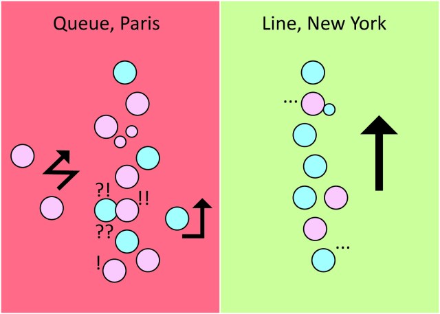 Faire la queue. Un grand moment d’angoisse à Paris quand on est Alsacienne (et qu’on aime l’ordre comme le veut le préjugé) et Parisienne à la fois (et qu’on est fortement travaillée par l’envie de resquiller, comme tout digne Parisien – ou Français au Sud de la Loire). Concrètement, je garde toujours un œil angoissé (et potentiellement indigné) sur les resquilleurs potentiels tout en cherchant moi-même un moyen de dépasser les autres… Et puis on n’ose pas trop faire la remarque aux tricheurs, car la triche étant un sport national on ne peut donc pas reprocher à ses compatriotes de le pratiquer.