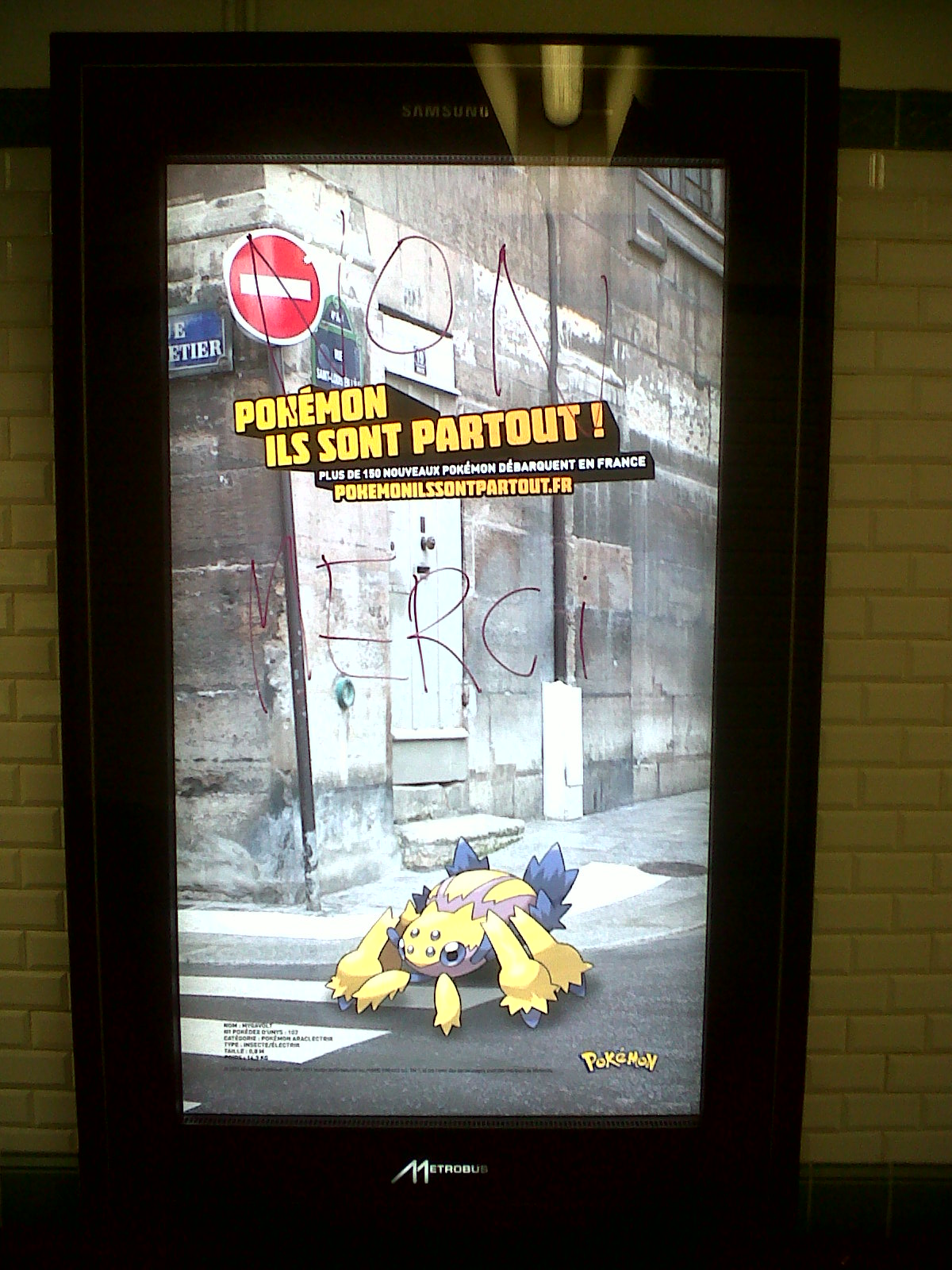 Le bon maire de notre capitale est un homme sympathique, qui non seulement assume son homosexualité mais surtout surtout SURTOUT était un grand ami de l’immense chanteuse au regard torve (oui, Dalida of course ! qui fut ma voisine virtuelle à Montmartre avec quelques 23 ans d’avance mais ce n’est qu’un léger détail). Mais mais mais mais mais… (car il y a toujours un mais, que serions-nous sans mais ?) notre bon édile est aussi un grand publicitaire, et ça balance de la pub partout à Paris. Enfin, ce brave homme n’est surement pas seul responsable (avoir été l’ami de Dalida rachète un nombre faramineux de péchés à mes yeux). Toujours est-il que ça y va, des vieilles pubs peintes sur des murs lépreux depuis les années 50 (Dubo, Dubon, Dubonnet) aux panneaux lumineux Vélib’ (1700 panneaux pour JC Decaux) mais aussi à la télé dans les bus (2 minutes de soi-disant info pour justifier ensuite 5 minutes de matraquage de spots publicitaires… cependant ce dispositif n’est pas encore généralisé, alleluiah !) et surtout, horreur, malheur… ce truc qui te saute à la gueule au tournant des couloirs du métro… des panneaux publicitaires télévisuels tout polluants ! Comme le dit si bien cette splendide photo (oui je sais je suis le futur Robert Capa), « Ils sont partout » – « Non merci! »