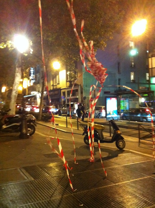 Une bande rouge et blanche en plastique qui voltige au-dessus d’une bouche de métro