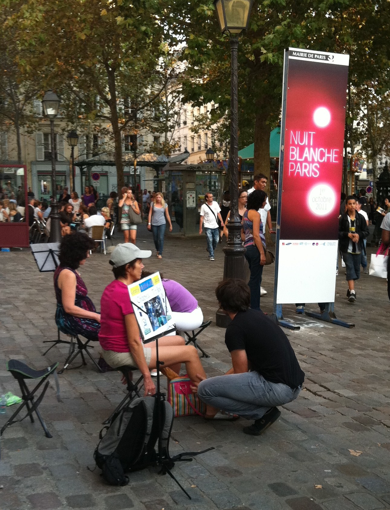 Voici une initiative sympathique, qui a disparu avec les beaux jours enfuis (à Paris l’automne vous tombe dessus d’un coup, bam ! il est là, il fait 15 degrés et les feuilles mortes rentrent dans les couloirs du métro) : sur la place des Abbesses deux sympathiques citoyens armés d’un petit tabouret en toile proposaient aux passants des massages gratuits.