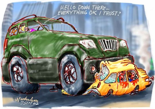 It seems that women are big consumers of this transportation mean, because it gives them the impression to be safe. Well honey, if you forget to close your door it’s not the size of the vehicle that will get you of trouble, nor improve your driving, for everyone knows that danger, woman driver ahead (oh, come on, I know, I’m also a woman, but still…)