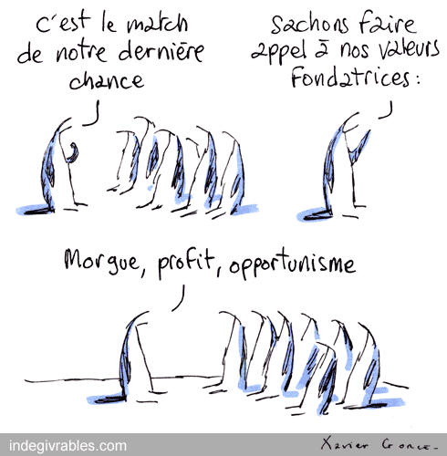 Vous m’excuserez, mais ces gars qui courent d’un côté à l’autre du terrain pour donner des coups de pied dans une baballe, affublés de chasubles aux couleurs de la mondialisation, pour des salaires indécents, ça ne me fait pas grave kiffer. Mais le surmoi masculin est si fort que même les plus gauchistes ne peuvent supporter la discussion sur ces sujets (Oui mais tu peux pas COMPRENDRE de toute façon).