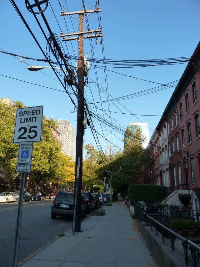 Quant aux poteaux électriques, les pauvres portent toute la misère du monde : haute tension, wi-fi, fibre optique, tout tout tout sur le même poteau, rien n’est enterré donc, et chaque maison se branche à sa guise avec plein de fils qui pendent partout et des poteaux qui penchent dangereusement… Voyez la photo ci-dessus, prise à Jersey City une banlieue DENSE de New York (oui ce n’est pas réservé aux périurbains lointains). Résultat au moindre petit coup de vent, pouf ! tous les poteaux sont soufflés et 5000 personnes se retrouvent sans électricité pour 2 jours. Caramba ! Une petite tempête de 1999 et y a plus personne ici – tout le chambardement sur la mauvaise gestion de l’épisode neigeux par le gouvernement en France me fait bien rigoler : cet automne la Long Island Rail Road compagnie (un RER new-yorkais en gros) faisait une campagne de pub pour expliquer que des retards pourraient s’expliquer par… la chute de FEUILLES sur la voie !!