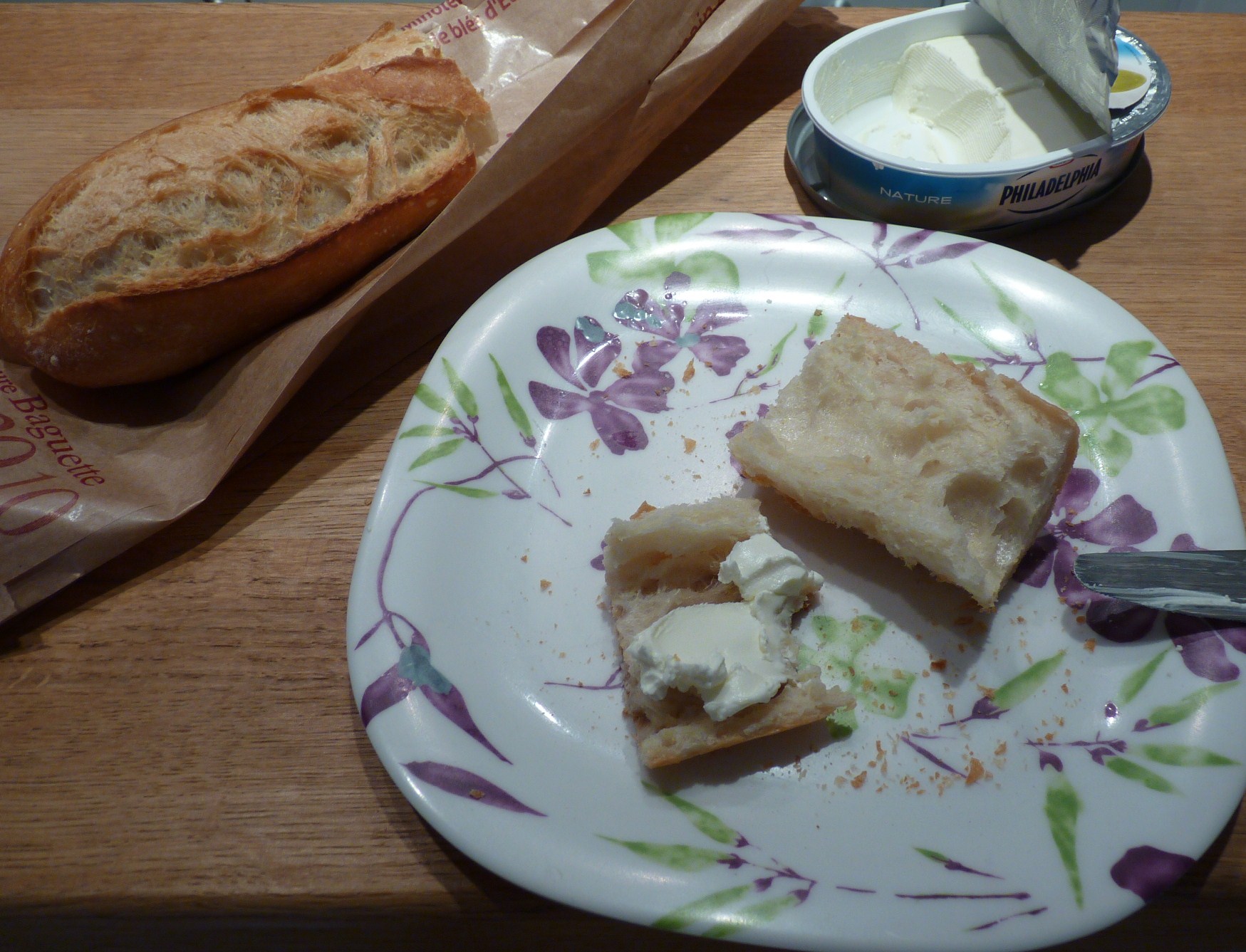 It’s so simple, but it’s too good: a little cream cheese (thanks to my Parisian supermarket, it’s only Philadelphia but it still rocks!) on fresh-baked baguette.