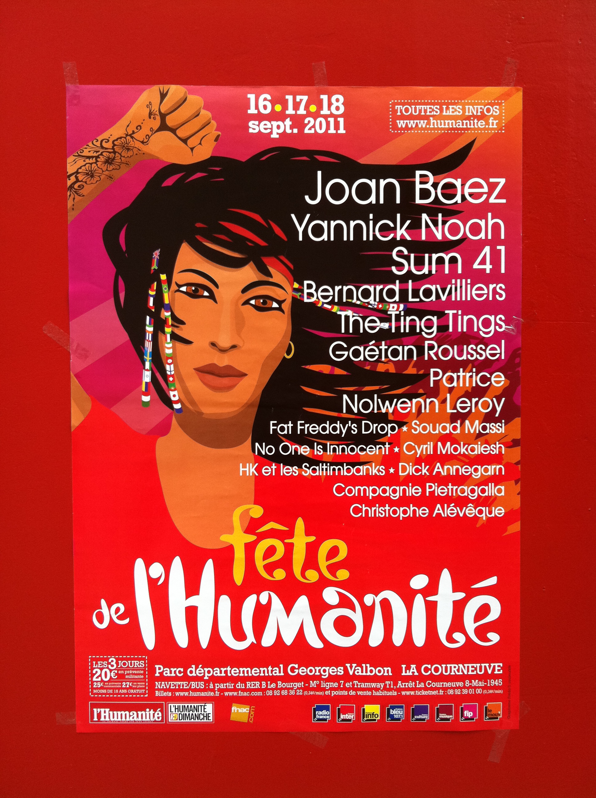 Today is the opening of the Fête de l’Humanité (1), celebrated on a red poster, on a red wall, somewhere in the 13th arrondissement of Paris – and on lots of other walls in Paris.